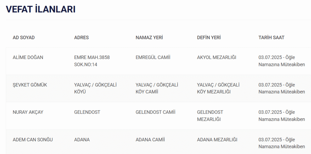 Haberler Isparta 03/07/2025 Vefat Edenler 03/07/2025 Vefat Edenler Haber Servisi tarafından hazırlandı 3 Temmuz 2025, 10:12 yayınlandı 3 Temmuz 2025, 10:12 güncellendi 0dk, 0sn 6 + - 03/07/2025 Vefat Edenler Yorum Yap Paylaş Haberle ilgili daha fazlası:# ısparta # vefat Tamamen Ücretsiz Olarak Bültenimize Abone Olabilirsin Yeni haberlerden haberdar olmak için fırsatı kaçırma ve ücretsiz e-posta aboneliğini hemen başlat. Abone Ol