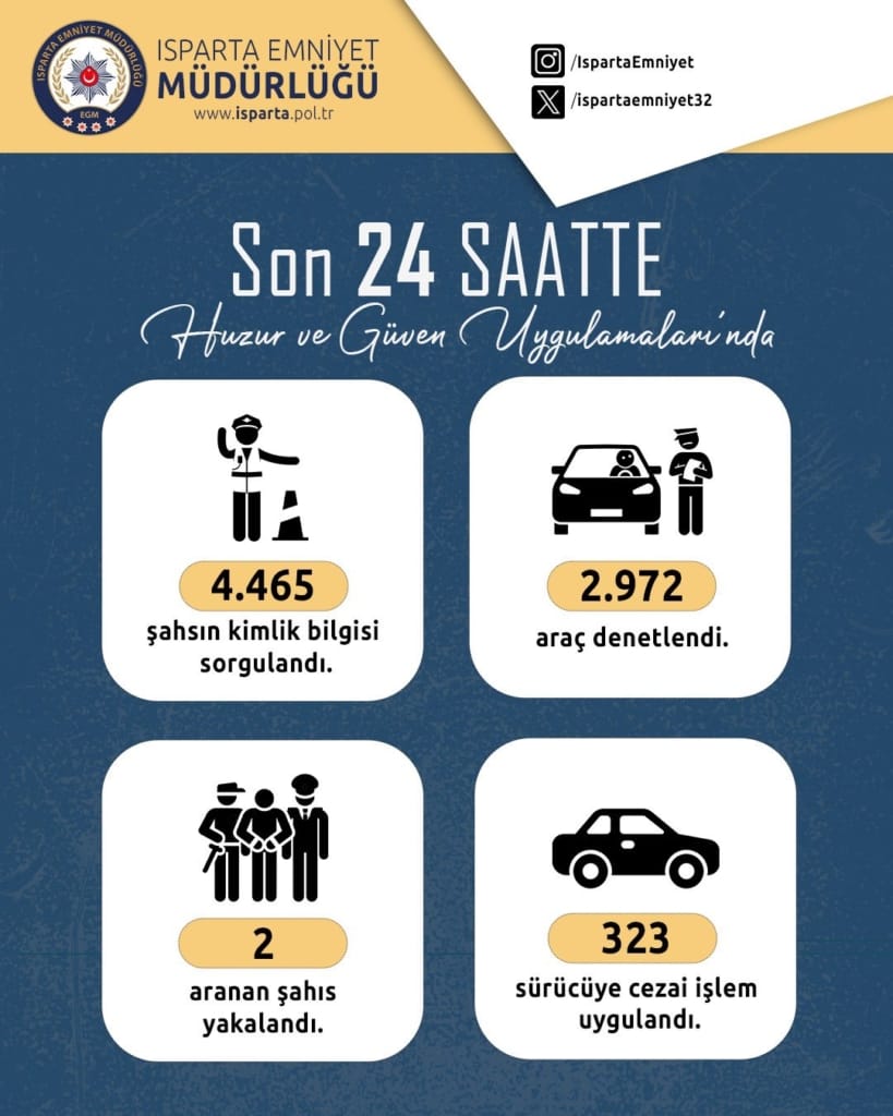 Isparta Emniyet Müdürlüğü, son 24 saat içerisindeki “Huzur ve Güven Uygulamaları”na ilişkin verileri kamuoyuyla paylaştı. Yapılan çalışmalar sonucunda, 4.465 kişinin kimlik bilgisi sorgulanırken, 2.972 araç denetlendi.