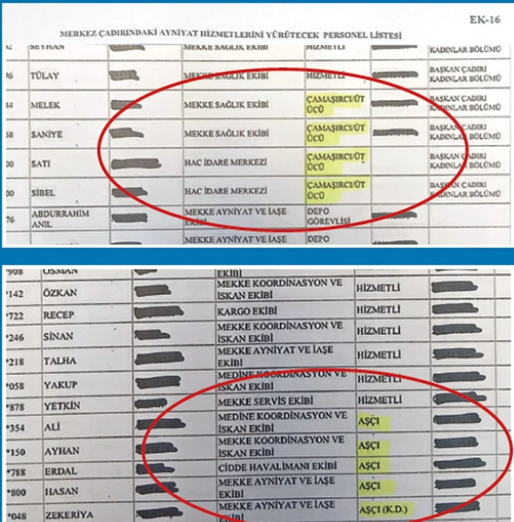 SÖZCÜ’nün ulaştığı belgede hacca götürülen çamaşırcı ve ütücü personel isim isim yer aldı.