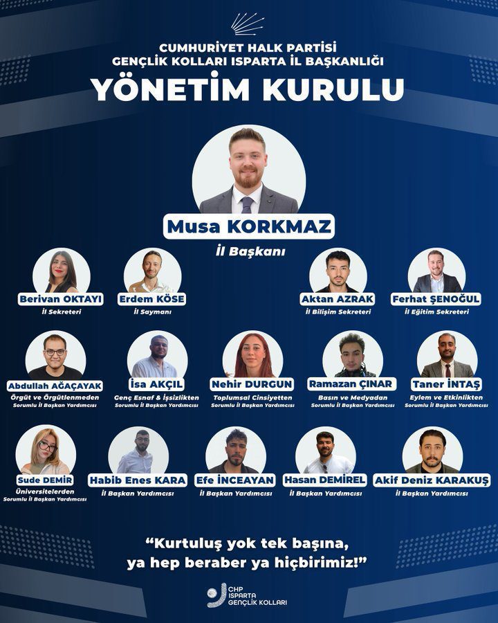 CHP Isparta Gençlik Kolları İl Başkanı Musa Korkmaz, yeni yönetim kurulu ile birlikte Isparta’da gençliğin sesini daha gür çıkaracaklarını belirtti. Korkmaz, “Yolumuz açık, mücadelemiz kararlı! Yönetim kurulumuz tüm örgütümüze hayırlı olsun” ifadelerini kullandı. Açıklamada, “Kurtuluş yok tek başına, ya hep beraber ya hiçbirimiz!” sloganına da yer verildi.