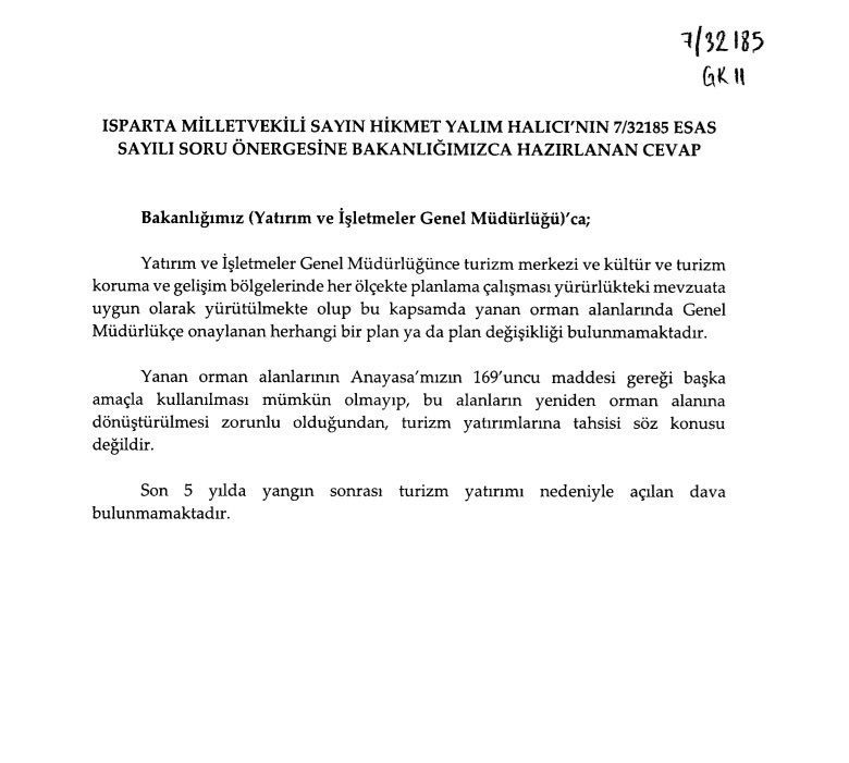 Milletvekili Halıcı, Bakan Ersoy’a “yanan ormanlık alanların ne kadarına otel yapıldığını” sorduğunu ve “Yanan ormanların yerine otel yapılması söz konusu değildir” yanıtını aldığını belirtti.