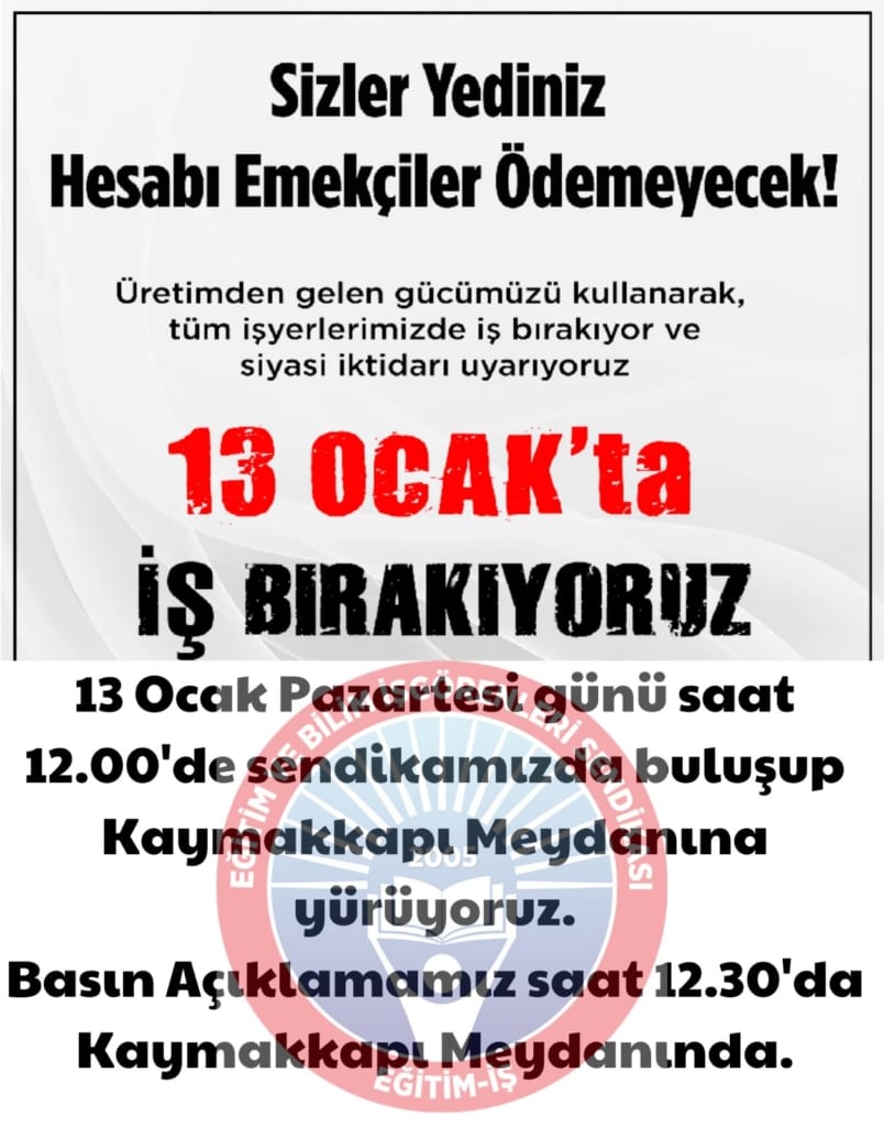 Değerli dostlar, Mesleğe başladığımız ilk günden bu güne en büyük hedefimiz Atatürkçü, Cumhuriyetçi nesiller yetiştirmek oldu. Zorluklarla karşılaştık mi evet, haksızlığa uğradık mi evet lakin bizler bu ilkemizden sapmadan günümüze kadar geldik. Bugün de yine dar bir boğazdan geçmekteyiz. Özlük haklarımız için verdiğimiz mücadelenin yanında şimdi de ekonomik haklarımız için mücadele edeceğiz. Ek ve yan ödemelerin emekli aylıklarına dahil edilmediği ve bu sebeple emekli aylıklarımızda yaşanan %55’lik kayıp için, bununla birlikte İktidarın tabiri caizse “lütfettiği” %11.54’lük sözde zammı kabul etmediğimiz ve hakkımız olanı almak için, sesimizi duyurmak için üretimden aldığımız güçle 13 Ocak Pazartesi günü iş bırakıyoruz. İnsanca yaşamak istiyoruz! Kimseden hak etmediğimiz ücreti istemiyor tam aksine hakkımız olanı almak için alanlara iniyoruz. Dostlar, 13 Ocak Pazartesi saat: 12.00’de sendikamızda buluşup Kaymakkapı Meydanına yürüyoruz. Basın Açıklaması saat 12.30’da Kaymakkapı Meydanında. Birlikte güçlüyüz, birlikte kazanacağız. Yaşasın Eğitim İş, yaşasın örgütlü mücadelemiz.