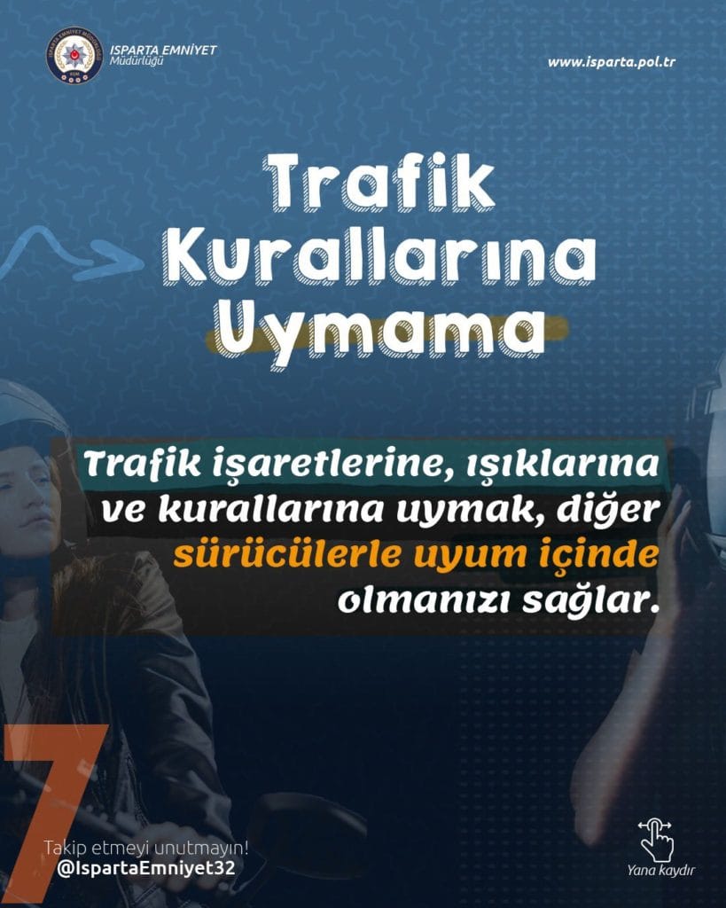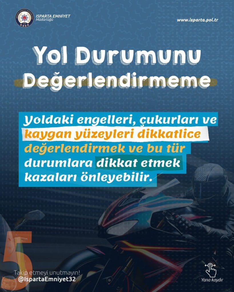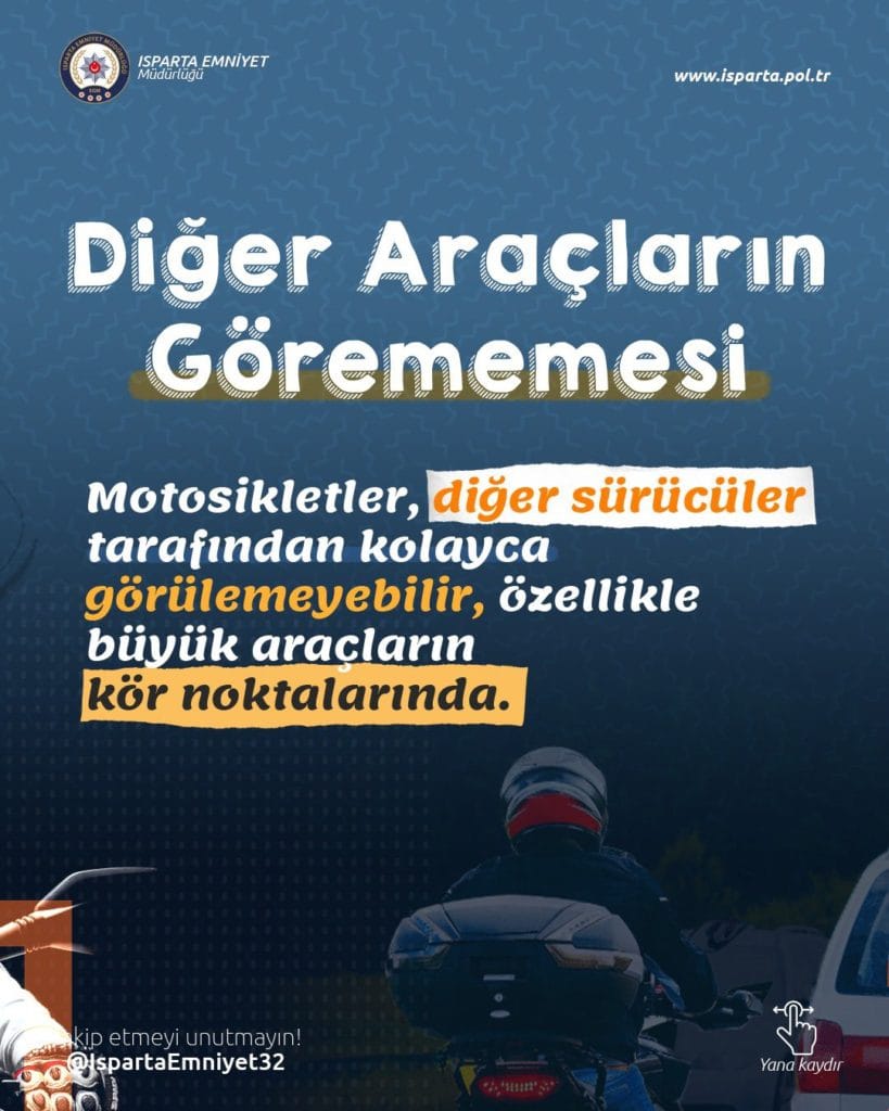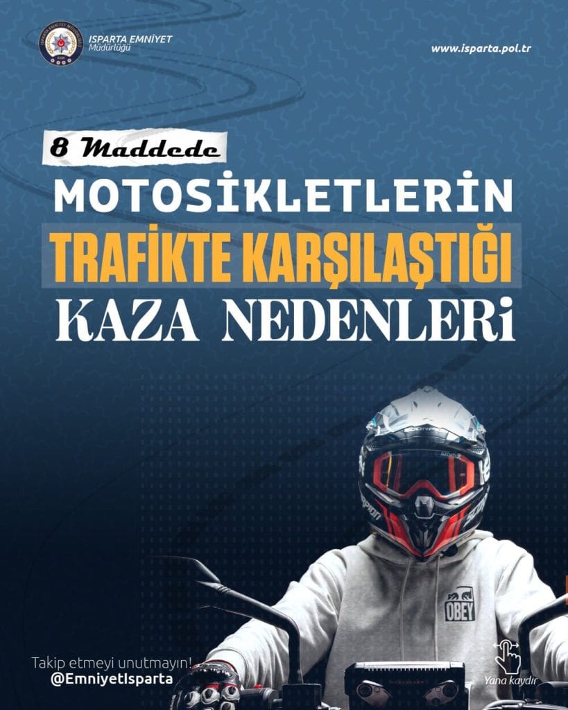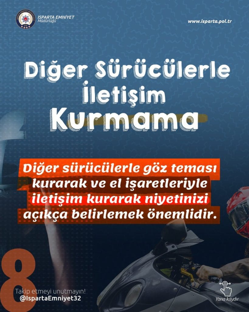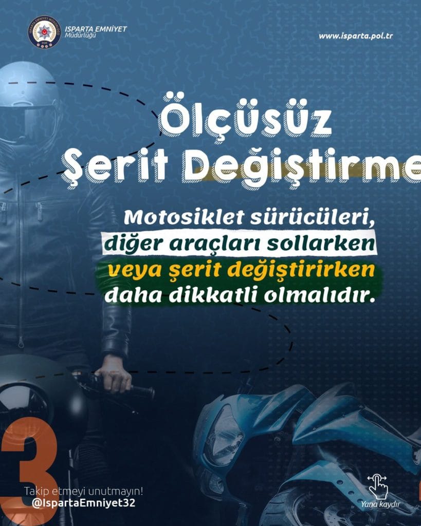 Isparta Emniyet Müdürlüğü Motosiklet sürücülerine uyarı niteliğinde bir broşür paylaştı. X hesabından paylaşılan broşürde Motosiklet sürücülerinin dikkat etmesi gereken trafik kuralları , motosiklet sürerken yapılması ve yapılmaması gerekenleri anlatan Isparta Emniyet Müdürlüğü çalışmaları ile göz dolduruyor .