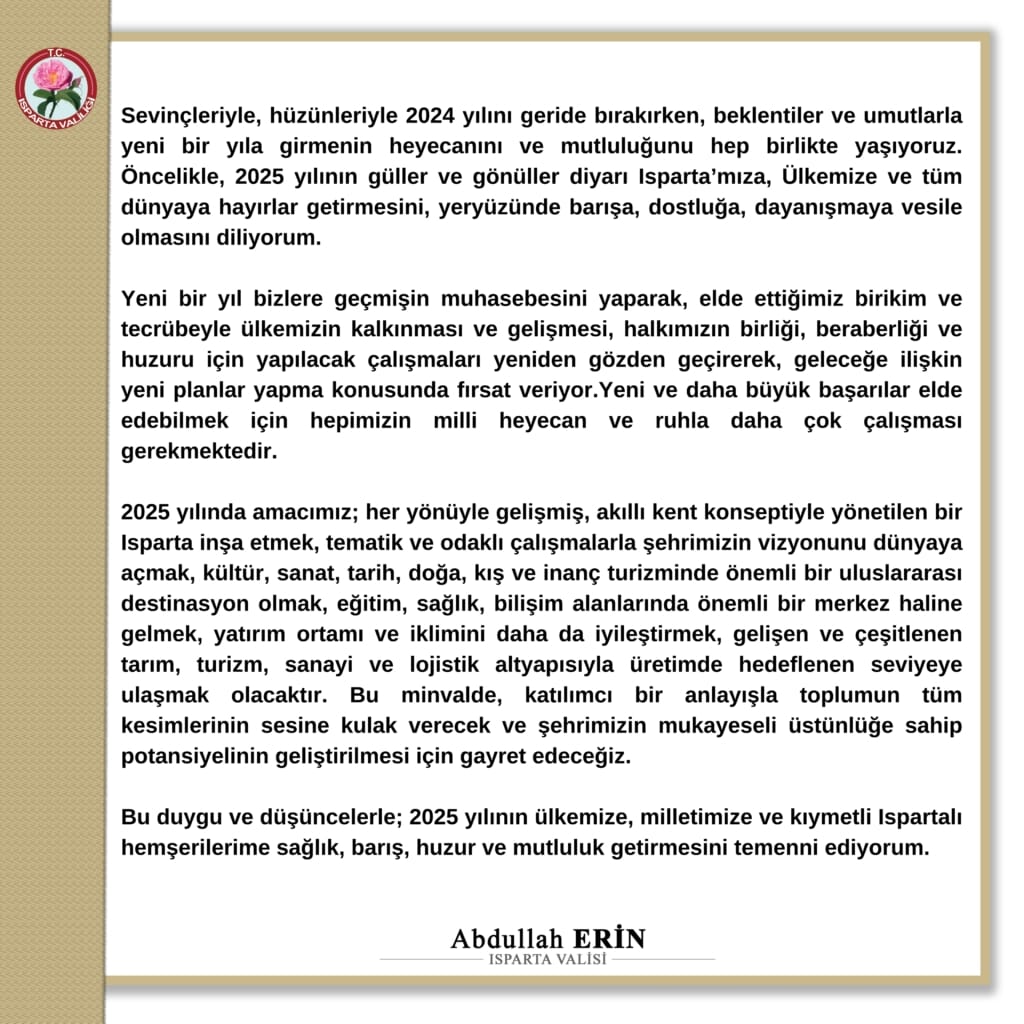 Sevinçleriyle, hüzünleriyle 2024 yılını geride bırakırken, beklentiler ve umutlarla yeni bir yıla girmenin heyecanını ve mutluluğunu hep birlikte yaşıyoruz. Öncelikle, 2025 yılının güller ve gönüller diyarı Isparta’mıza, Ülkemize ve tüm dünyaya hayırlar – 1