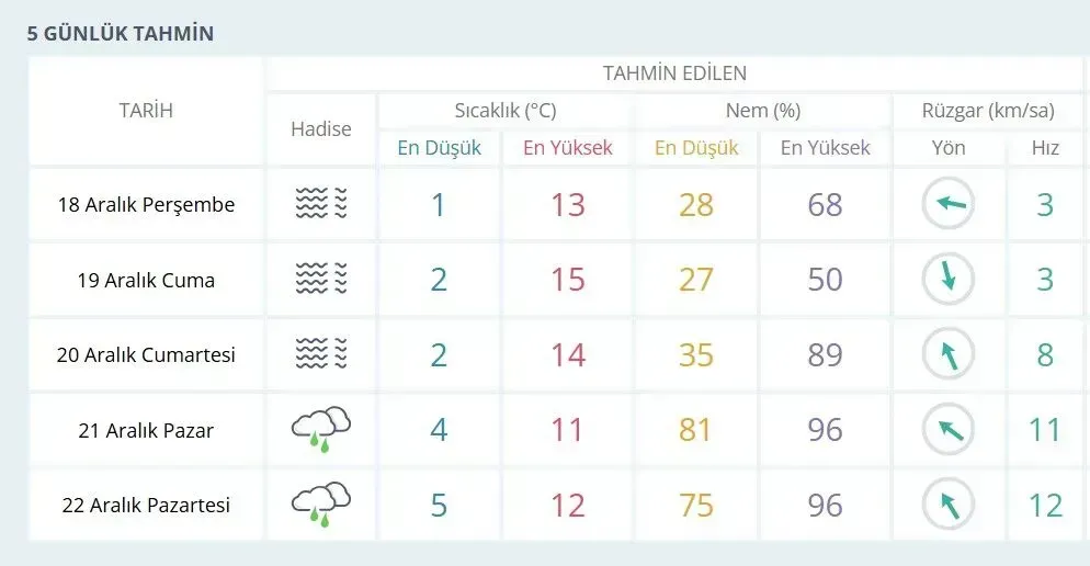 Hafta sonuna doğru bölgeye yeni bir yağışlı sistemin giriş yapması bekleniyor. Pazar günü kent genelinde yaklaşık 6 mm yağış düşeceği, yağışlı havanın Pazartesi ve Salı günleri de aralıklarla etkisini sürdüreceği bildirildi. Uzmanlar, sabah ve gece saatlerinde oluşabilecek sis, pus ve buzlanma olaylarına karşı sürücüleri dikkatli olmaları konusunda uyarırken, uzun vadeli projeksiyonlarda önümüzdeki dönemde kar yağışı ihtimalinin de bulunduğuna dikkat çekiyor.