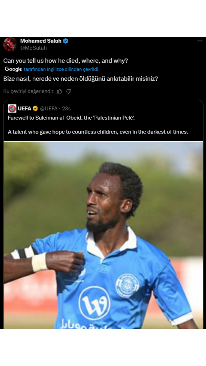 UEFA’nın, İsrail tarafından düzenlenen saldırılarda öldürülen Filistinli futbolcu Suleiman al-Obeid için paylaştığı taziye mesajına tepki yağdı.