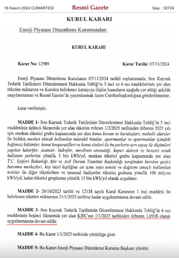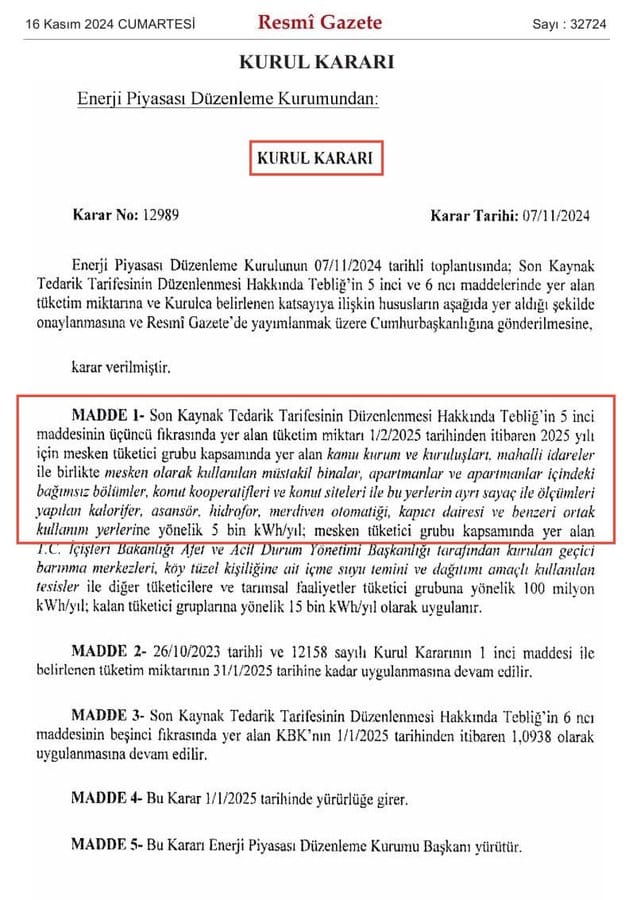 Yıllık 5 bin kWh tüketimin değişken fiyatlı tarifeye geçirileceğine dair EPDK kararı⬇️
