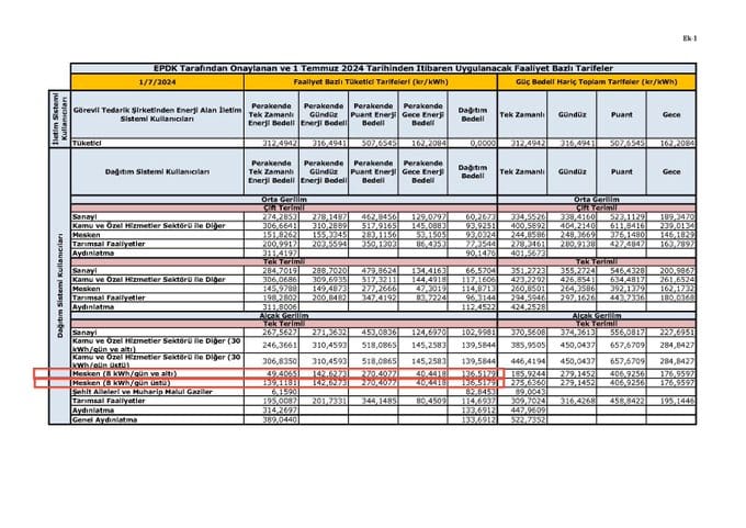 - Kademe: Günlük 8 kWh yani aylık 240 kWh ve altında tüketimi olan konut aboneleri.